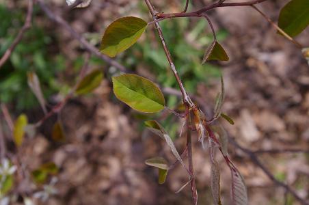 Serviceberry leaves are a smallish, finely toothed but usually with no teeth at the base. The leaf can be downy as barely visible in the photo (left) on the lower leaf. I note the petiole is often red.